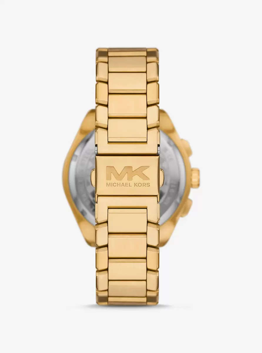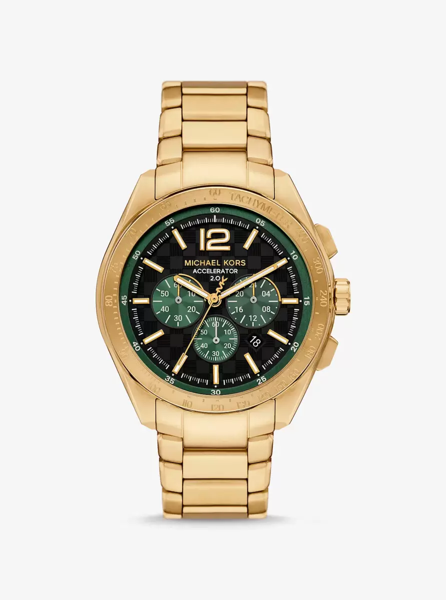 Meet the Accelerator 2.0. Made from gold-tone stainless steel, this oversized style encourages you to go for the bold. A green-trimmed bezel frames the sporty face, which features sleek hour markers, a date dial and chronograph details.