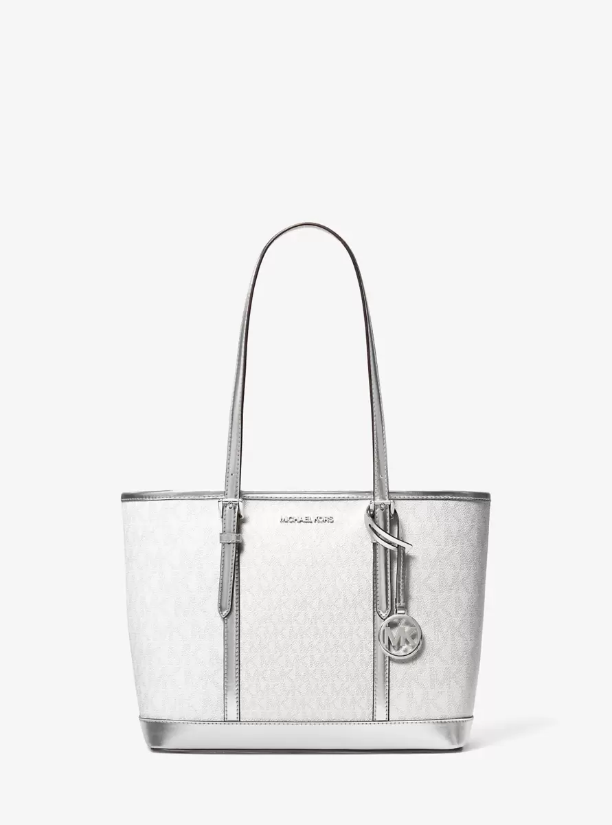 This Jet Set tote bag is the ideal travel companion. A perfect size, it’s roomy enough to store your essentials without weighing you down. Metallic logo-print canvas, high-shine accents and a silver-tone charm make a luxe statement, while a top-zip fastening ensures your belongings will stay in place—whether you’re in flight or on the ground.