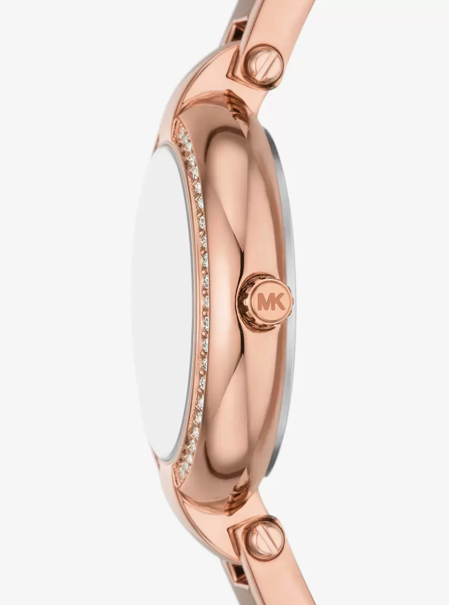 The mini Laney watch is a masterclass in understated elegance. Updated with a bangle-inspired design, it features a circular bezel dotted with pavé and a mother-of-pearl face with classic Roman numeral markers. Made from rose-gold-tone plated stainless steel, it’s designed to be worn for years to come.