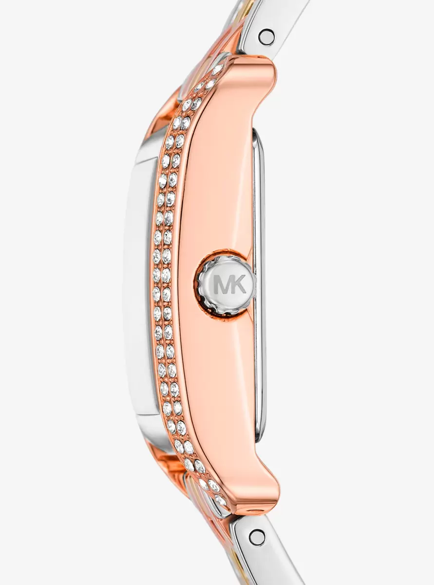 When it comes to statement-making style, it doesn’t get more eye-catching than our Monroe watch. The pavé-encrusted topring highlights the miniature-sized profile, while the tri-tone stainless steel strap is perfect for making an impression. Wear it alone, or stacked for next level arm-candy.