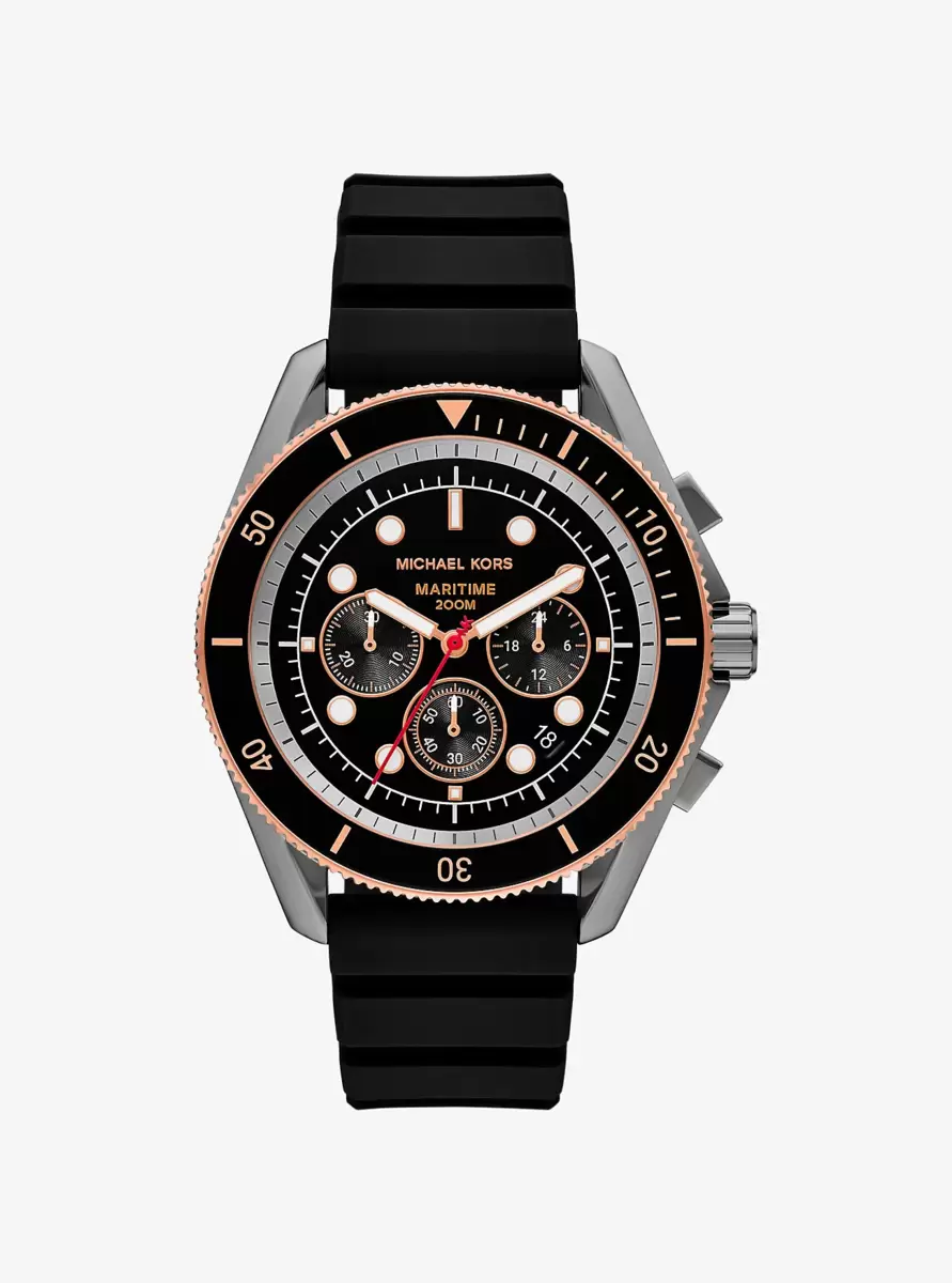 Dive into your next adventure with our maritime watch. Built to be resilient and withstand most underwater conditions, this sporty timepiece will confidently take you up to 200 meters underwater with a screw-down crown mechanism. The adjustable silicone strap wraps securely around the wrist, while the graphic face features a classic 3-hand dial and Super Lume technology that allows the wearer to track time in low light conditions.