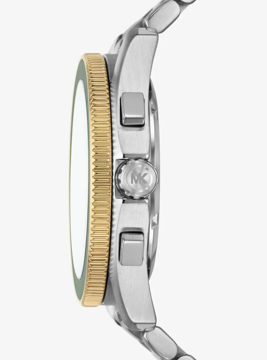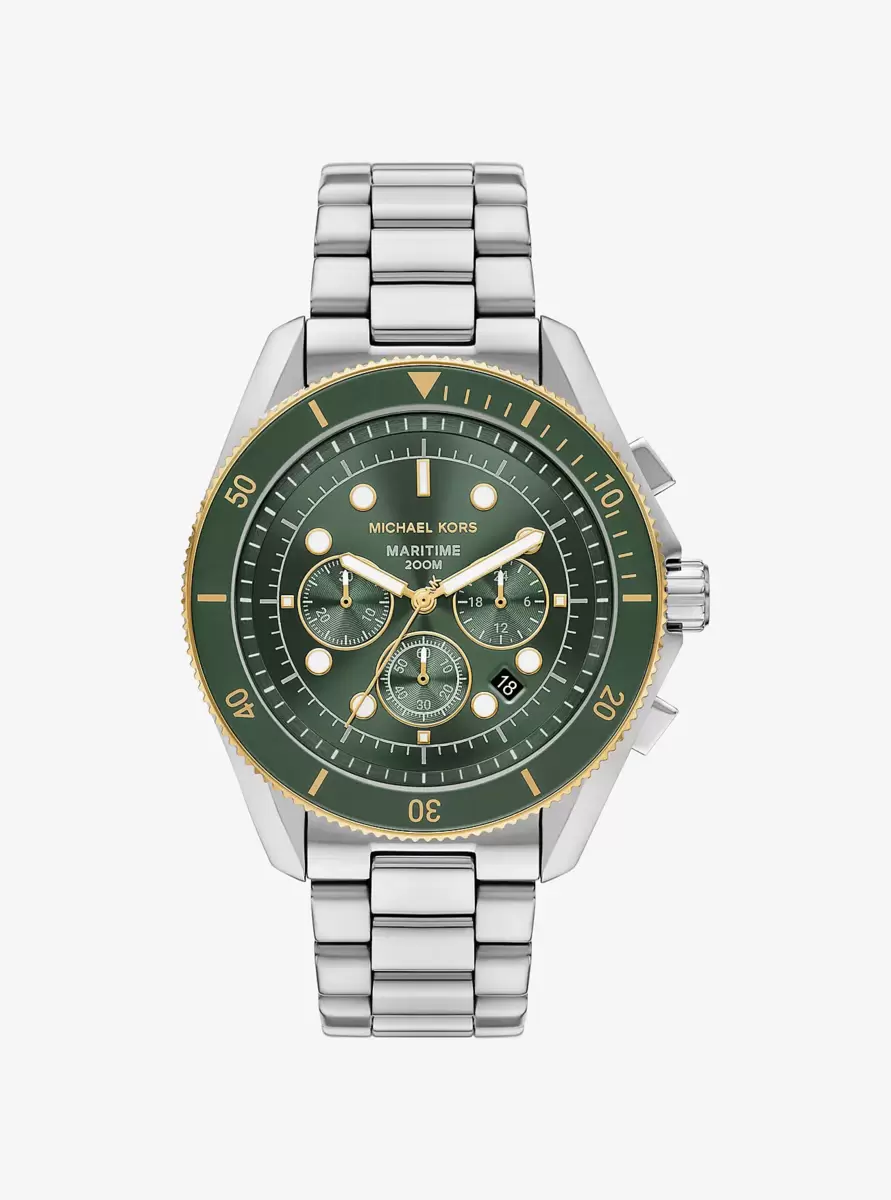 Dive into your next adventure with our stainless-steel Maritime watch. Built to be resilient and withstand most underwater conditions, this refined two-tone timepiece will confidently take you up to 200 meters underwater with a screw down crown mechanism. The olive-hued face features a classic 3-hand dial and Super Lume technology that allows the wearer to track time in low light conditions.