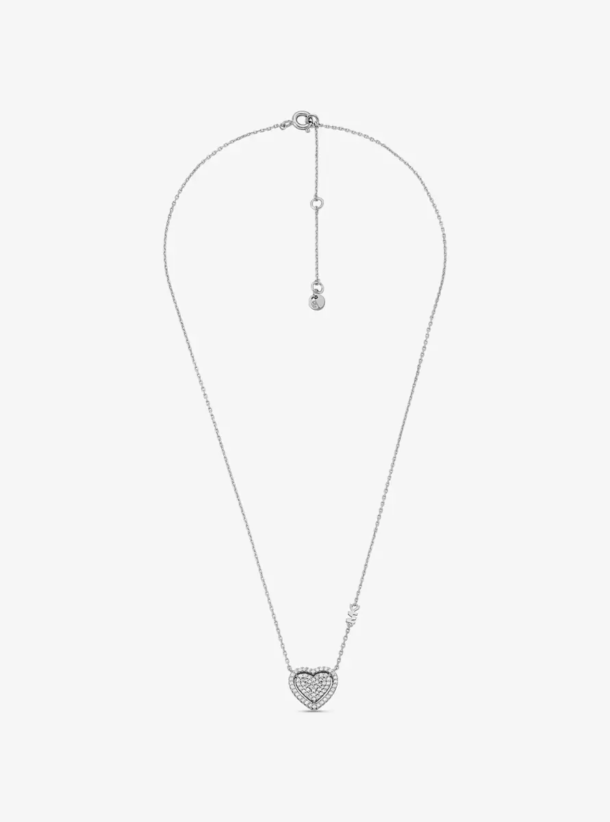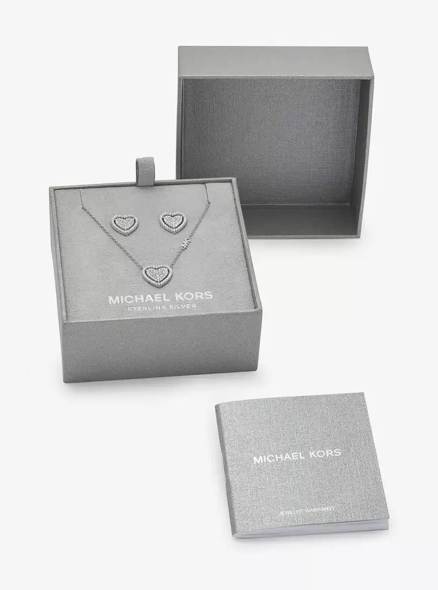 Birthday, holiday, just because—surprise and delight her with this glittering gift set. Encrusted with illuminating pavé accents, a heart pendant and matching stud earrings are sure to make her feel loved. Note the tiny MK charm punctuating the rhodium-plated sterling silver chain.