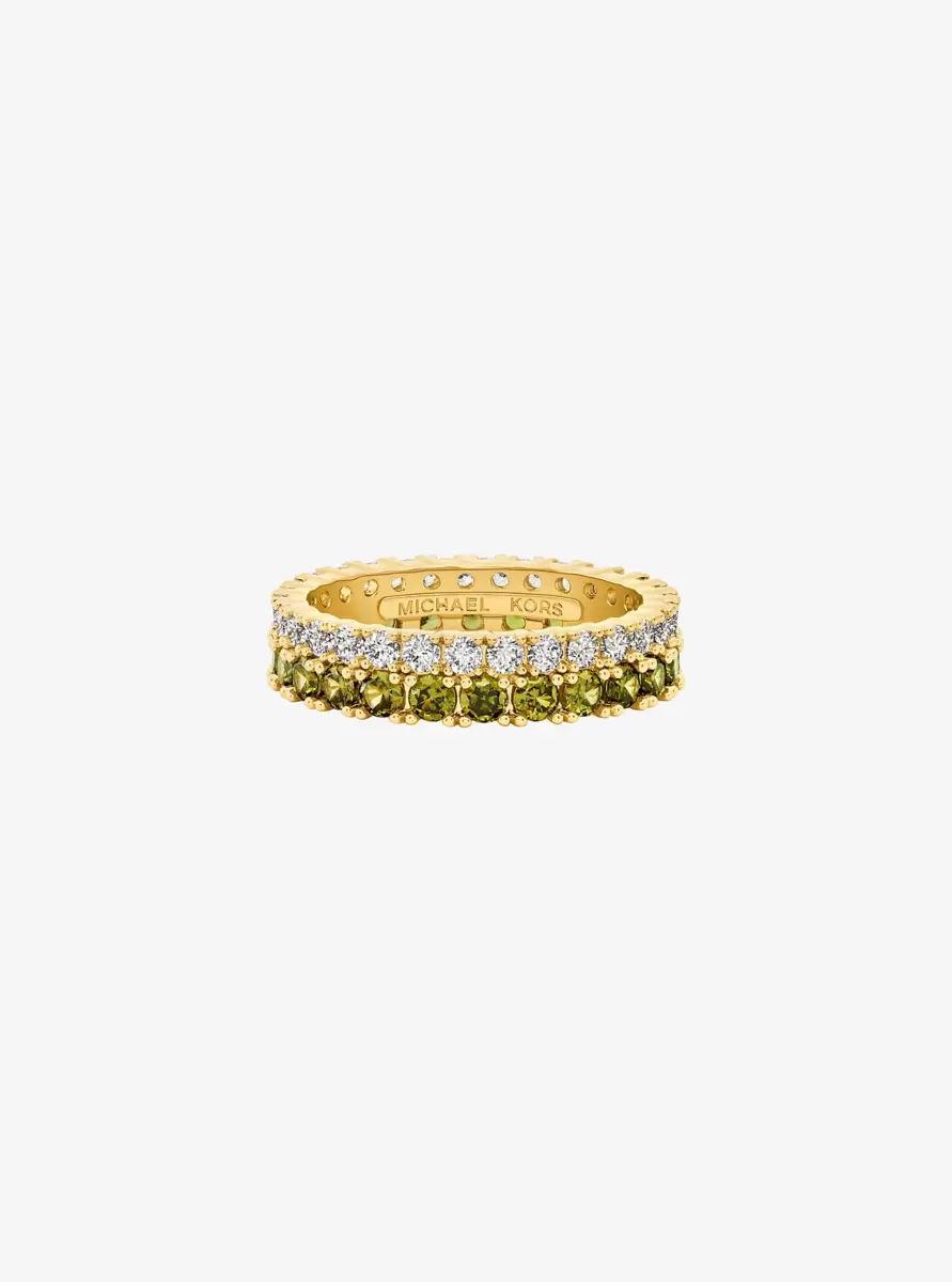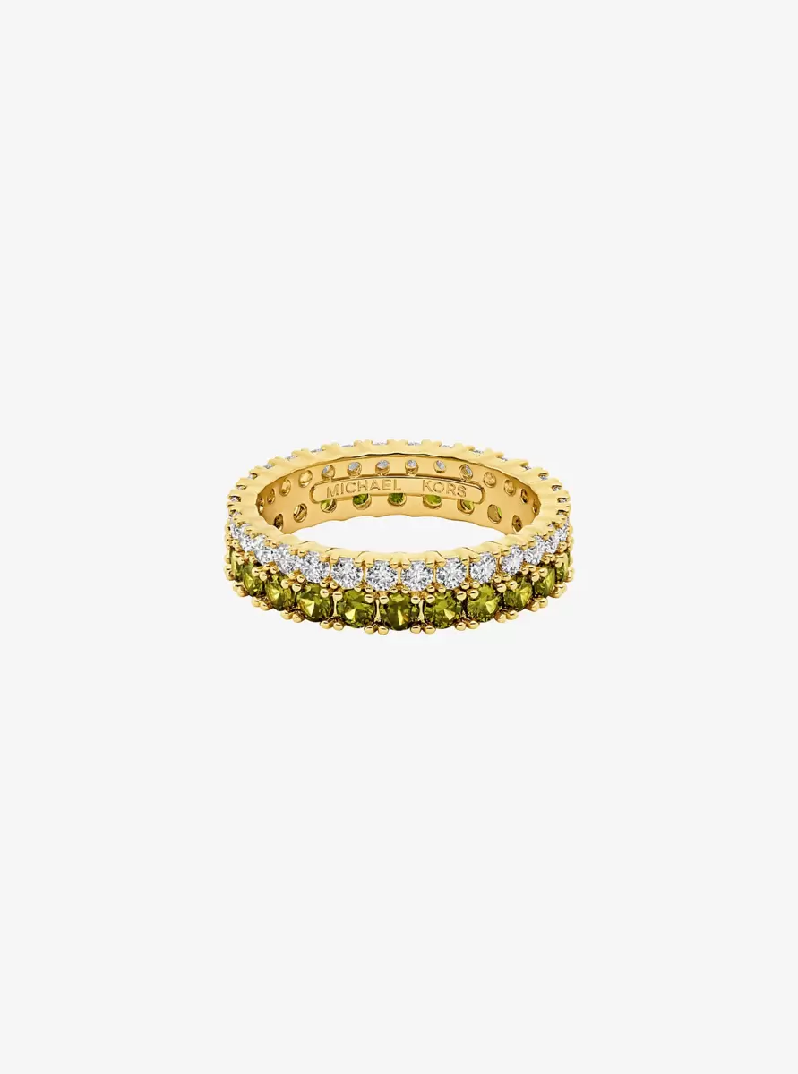 Give your jewelry collection a chic update with this tennis ring, a dazzling piece that’ll quickly become your favorite. Cast in brass, it features two rows of continuous pavé—each set with light-catching cubic zirconia in contrasting hues. Wear yours solo or stacked with other styles.