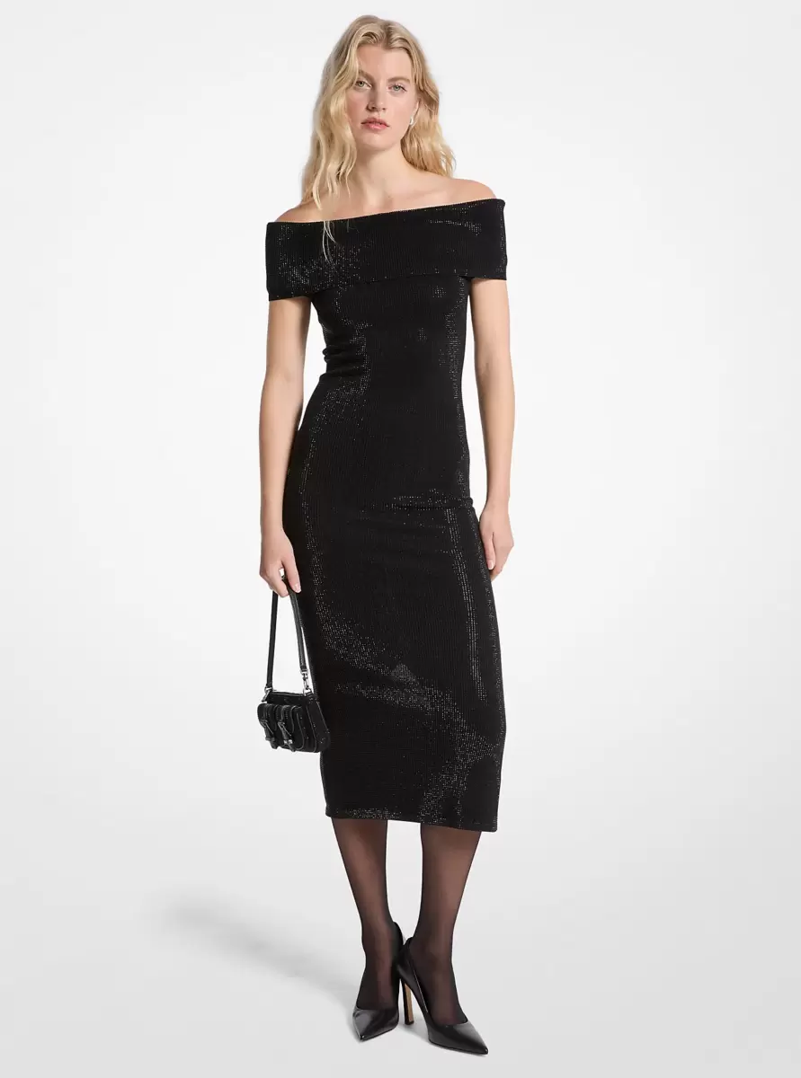 This stretch knit midi dress captivates with its allover sparkling embellishments and sophisticated off-the-shoulder silhouette. Designed with a fold-over neckline and figure-hugging fit, it features a subtle side slit for elegant movement. It’s perfect for cocktail events and special occasions when you want to make a memorable impression.