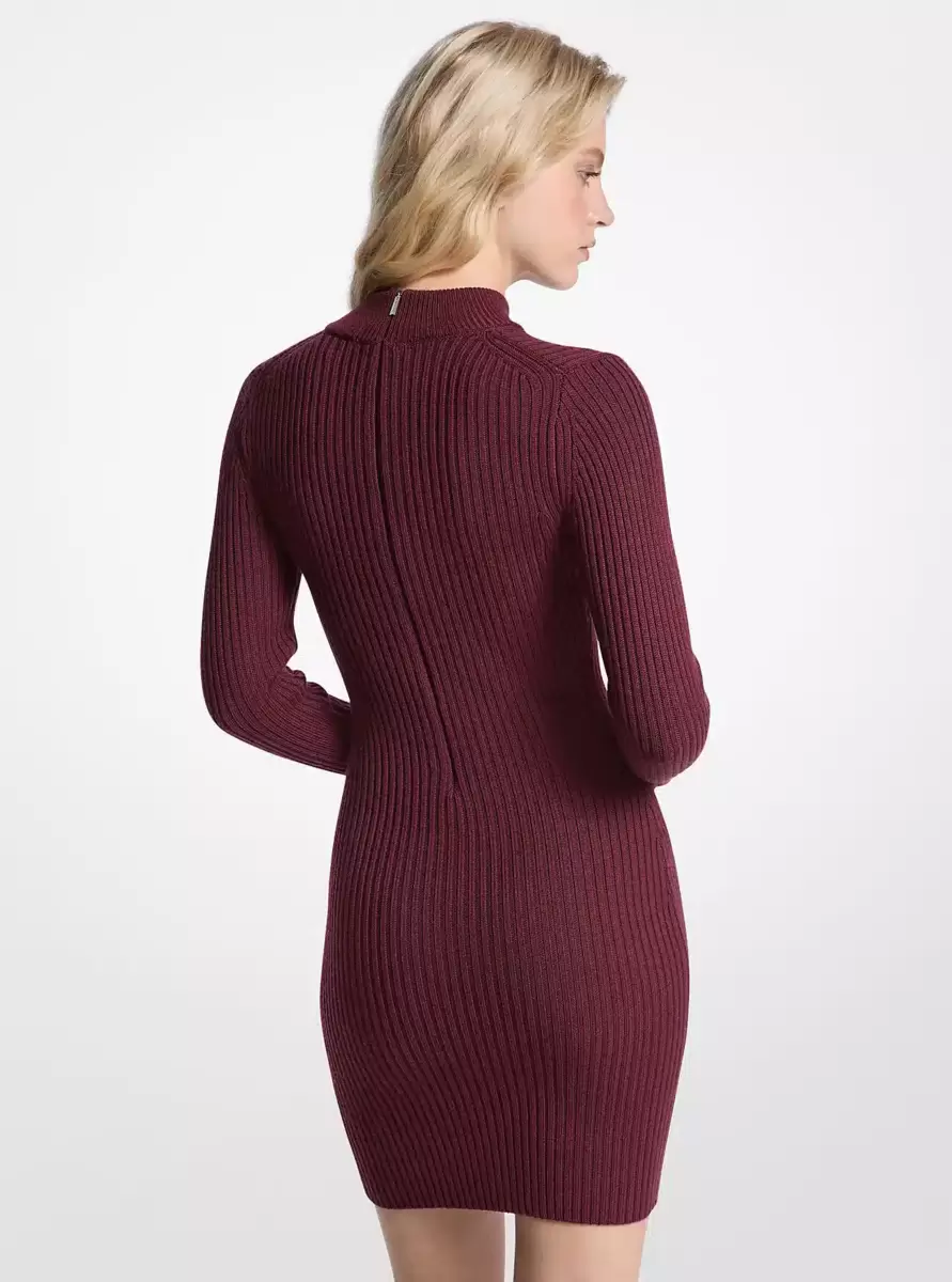This mini dress combines luxurious comfort with sleek sophistication in a figure-hugging silhouette. Crafted from stretch merino wool, it features a modern mock neckline and ribbed texture. It’s perfect for layering with tall boots and a structured bag for a sleek autumn look.
