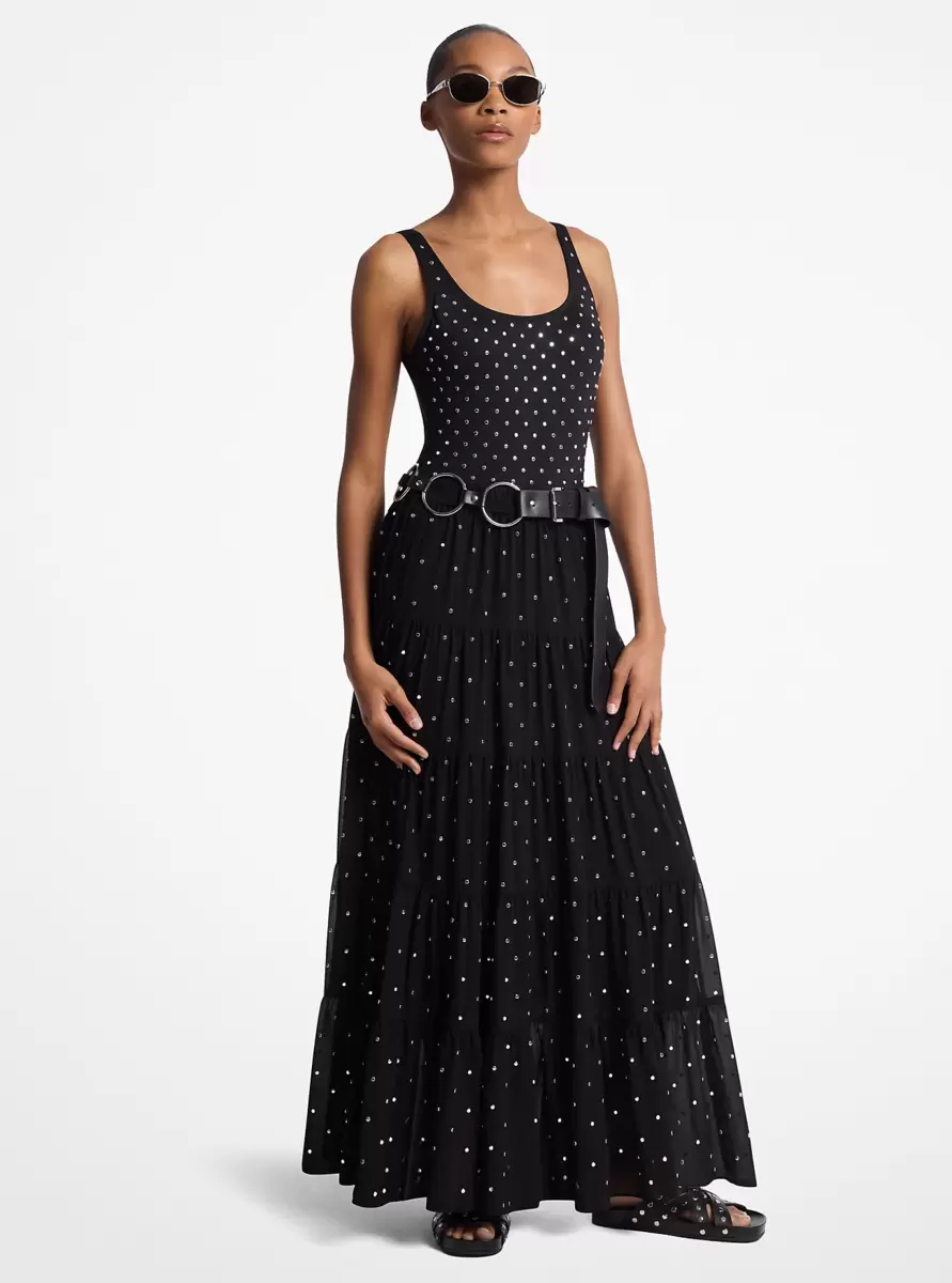This tiered maxi skirt feels effortlessly cool in lightweight georgette embellished with gleaming studs. Pair it with a coordinating tank and silver-tone accessories to strike a maximalist note.