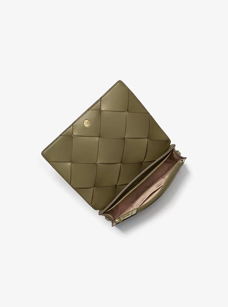A glamorous take on an everyday accessory, the Jet Set bag features a woven-leather exterior and high-shine details. It’s well sized to hold everyday essentials, and a removable strap provides the option to carry it as a clutch or wear it crossbody. Style it with a statement dress for a girl-about-town look.
