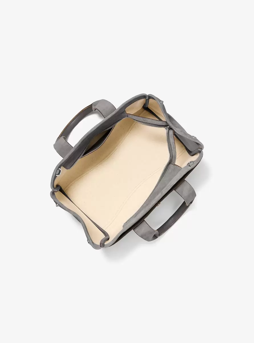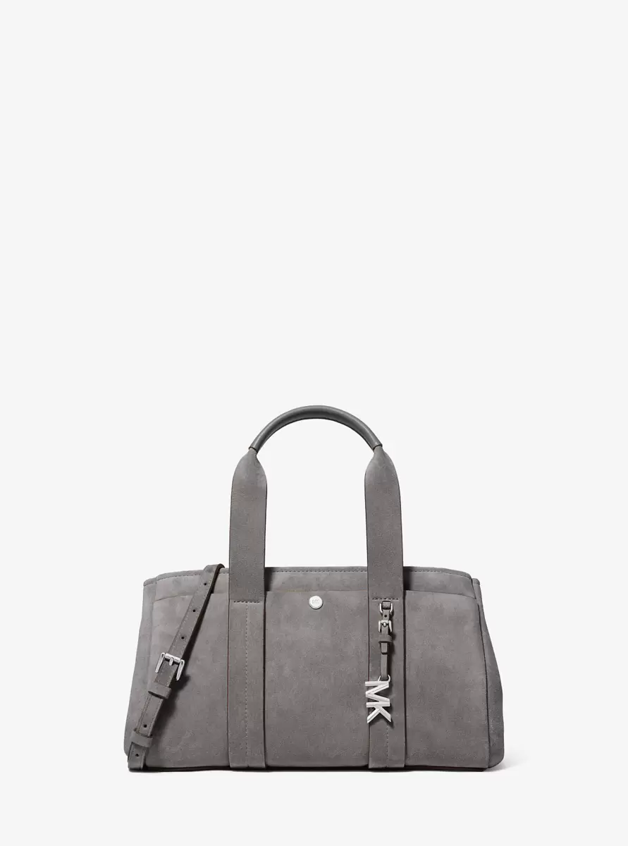 Contemporary glamour takes center stage with our Romee satchel. It’s crafted from suede and embellished with a polished MK logo charm. The sturdy top handles are sized to fit comfortably over your shoulder, while a crossbody strap delivers stylish hands-free wear.