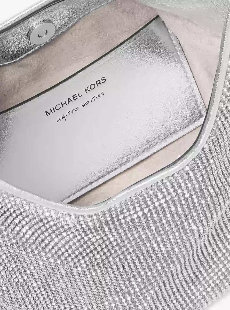 This Nolita hobo bag brings opulence to your everyday in a relaxed shape embellished with a rhinestone mesh overlay. It features a metallic leather shoulder strap with polished buckles for an adjustable fit. Inside the compact interior, you’ll find a slip pocket stamped with limited-edition lettering. We think it’s the perfect eye-catching finish to your nighttime ensemble.