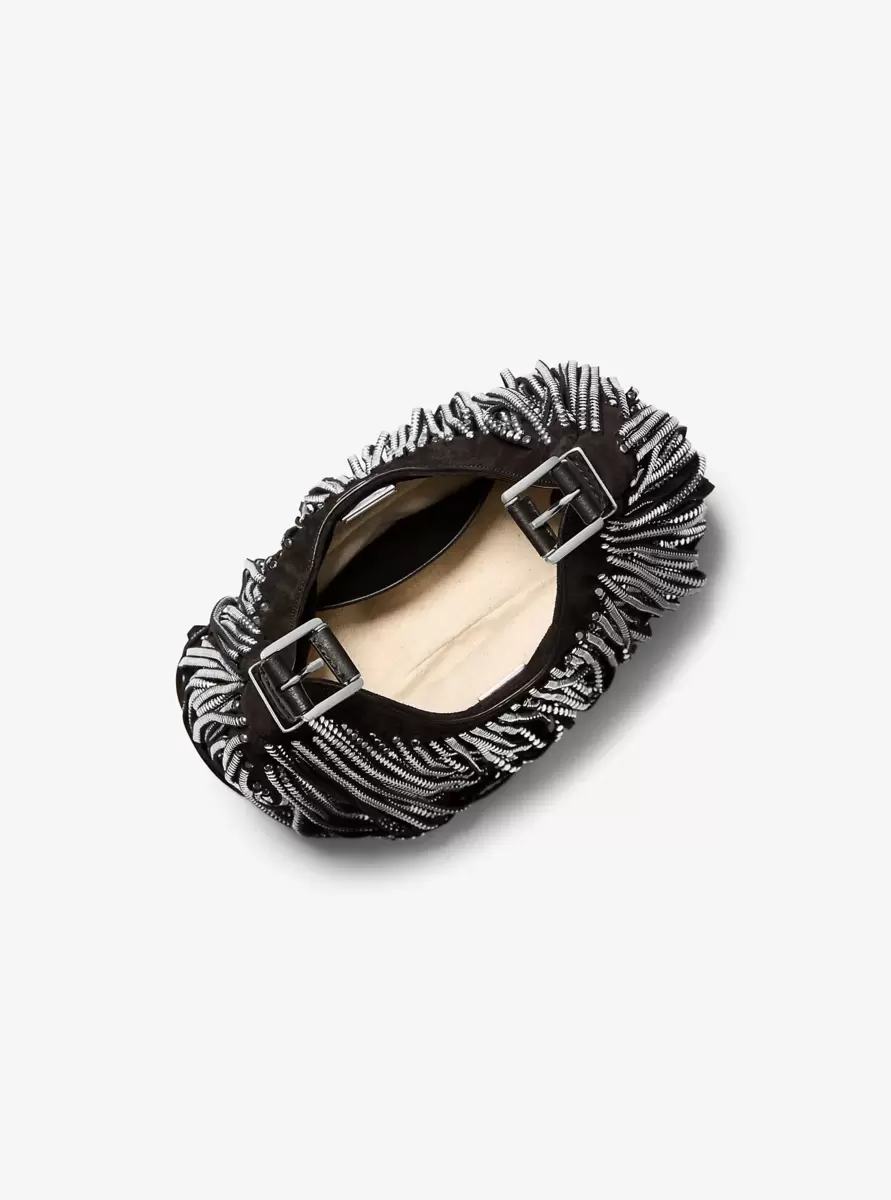 Draped in dramatic studded fringe, this eye-catching Nolita hobo bag adds opulence and a hint of western appeal to your everyday. The compact silhouette features a smooth leather shoulder strap with polished buckles for an adjustable fit. Inside the interior, you’ll find a slip pocket stamped with limited-edition lettering. We think it’s the perfect eye-catching finish to your nighttime ensemble.