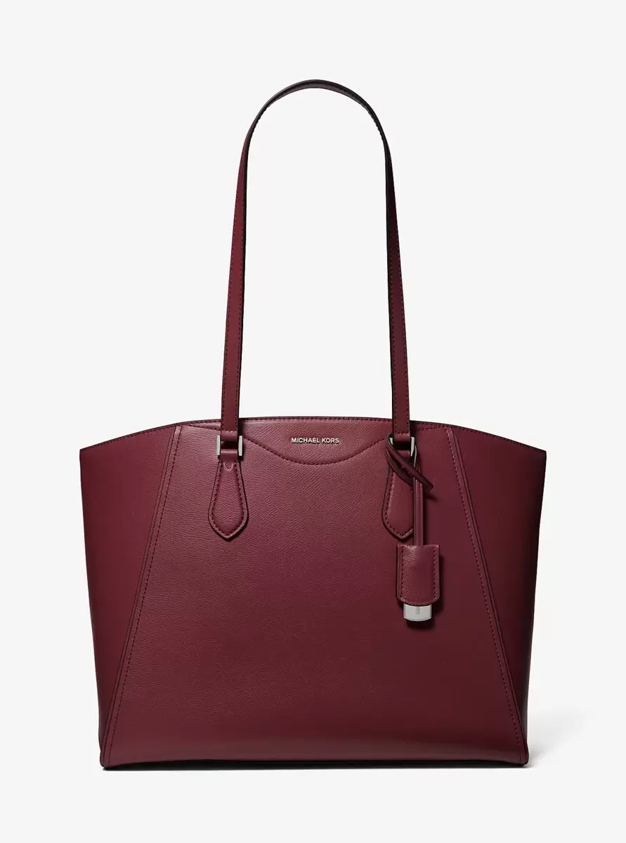 The Taryn tote is a polished staple for workdays, weekends, and every moment in between. Crafted from supple leather, this structured bag features trapeze stitching and a detachable lock charm. It unzips to reveal a spacious interior, complete with side pockets and a center compartment for your tablet or valuables.