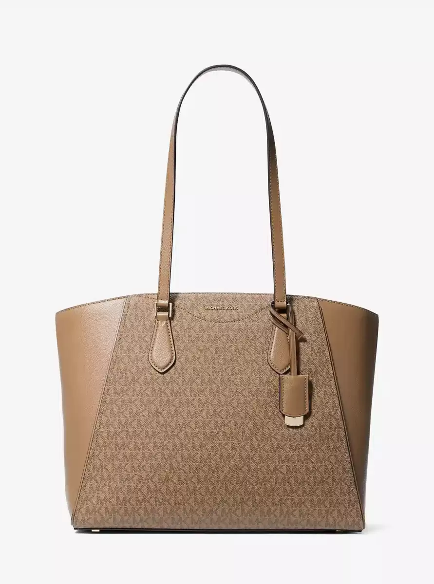 The Taryn tote is a polished staple for workdays, weekends, and every moment in between. Crafted from our Signature logo-print canvas with leather trim, this structured bag features trapeze stitching and a detachable lock charm. It unzips to reveal a spacious interior, complete with side pockets and a center compartment for your tablet or valuables.