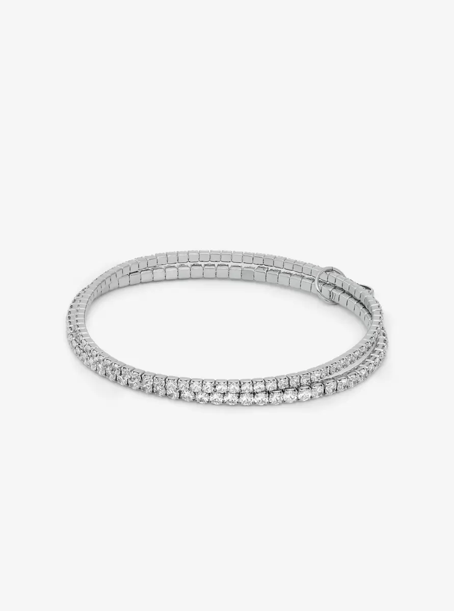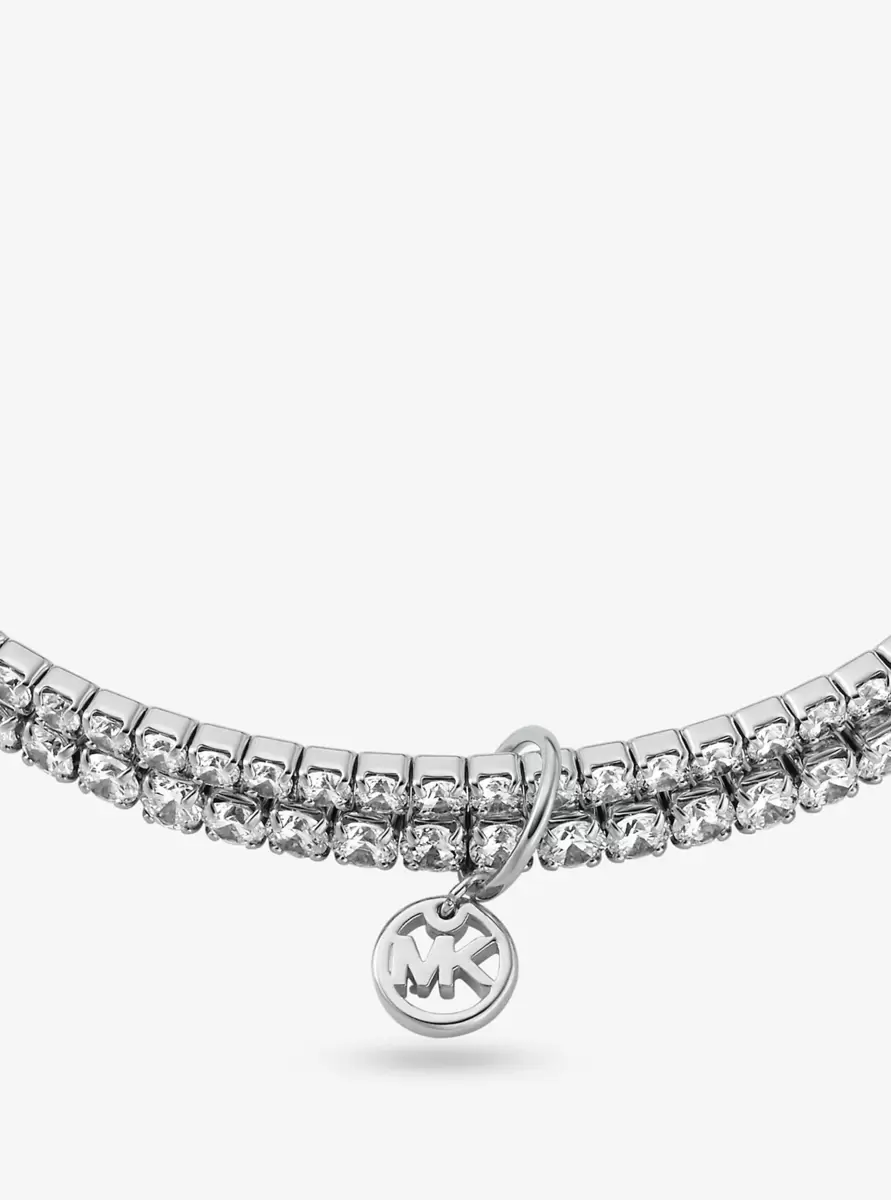 Timeless with a touch of the contemporary, this metal-plated brass tennis bracelet is strung with two strands set with a dazzling array of cubic zirconia. The elasticated design allows you to slip it on and off with ease. Layer yours over the cuff of your favorite shirt.