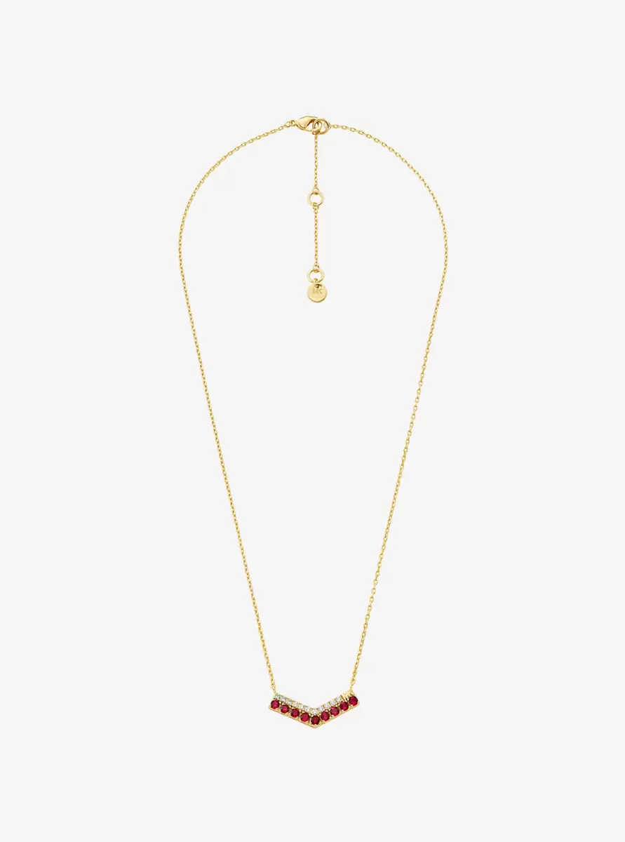 Smart enough for day and glamorous enough for night, this gold-tone brass necklace adds just the right amount of sparkle to your closet. It features a delicate fixed chain and a chevron-shaped pendant set with two rows of shimmering cubic zirconia in contrasting hues. Wear it to special occasions or as your everyday signature.