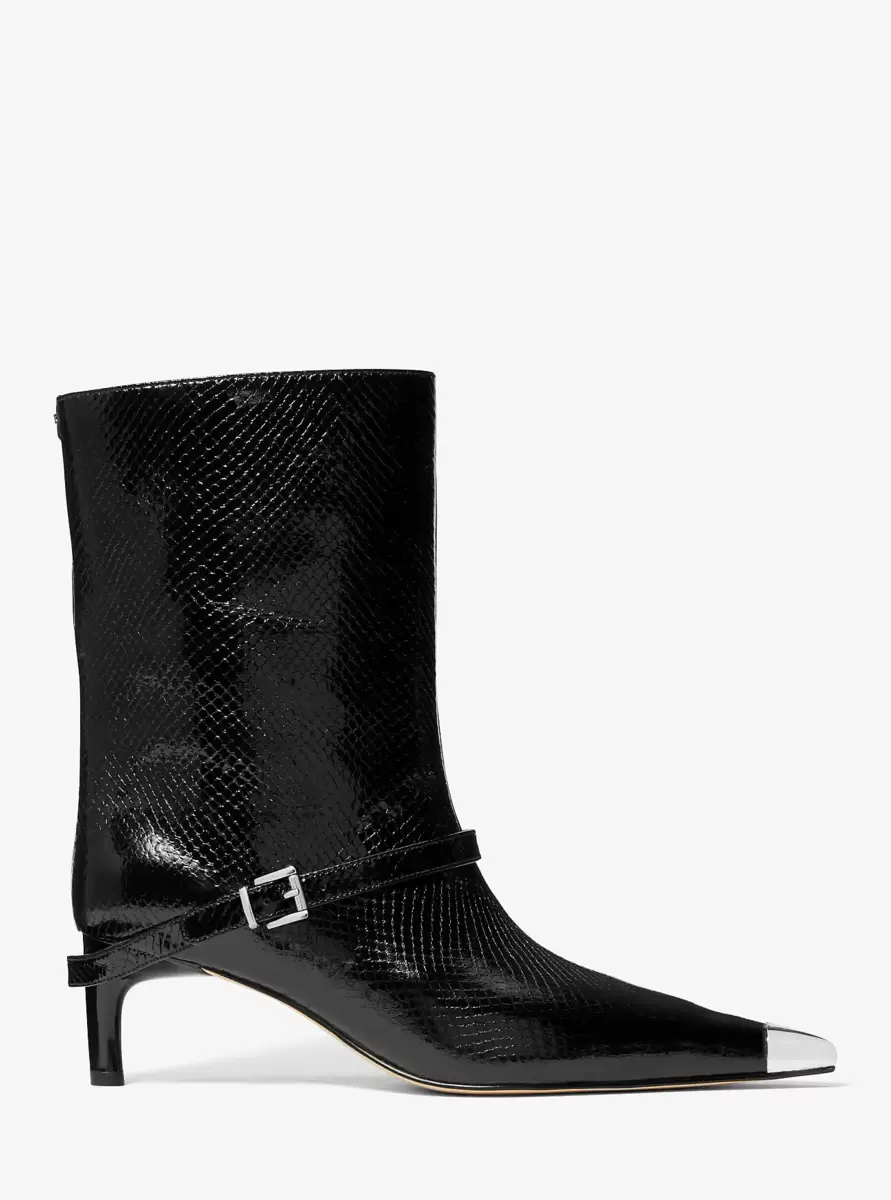 No other boot balances texture and shine quite like the Kasia. Crafted from snake-embossed leather, this sleek pair is defined by silver-tone hardware at the strap buckle and pointed toe. If you’re building an edit of chic wardrobe staples for the season, then add Kasia to your wish list.