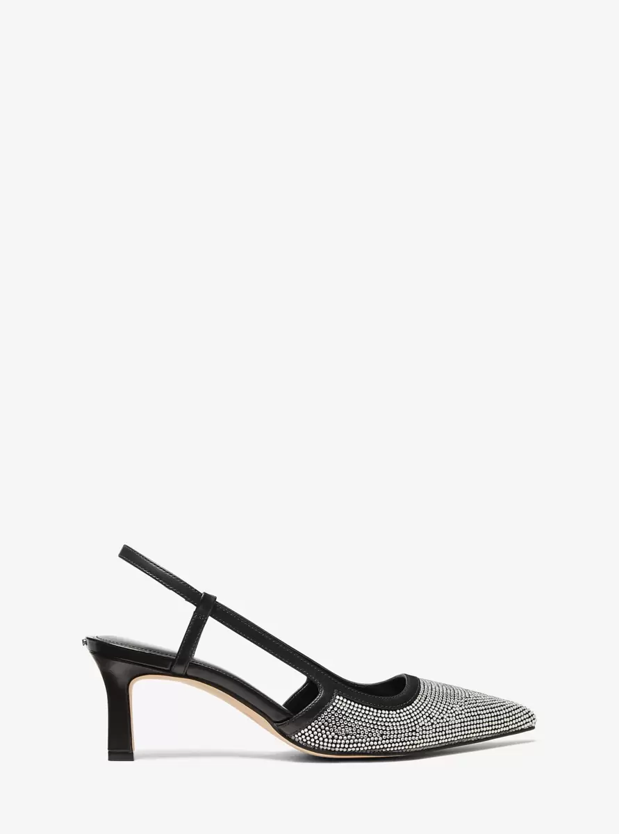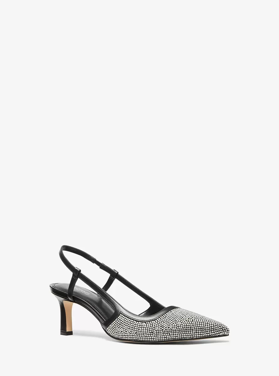 Cultivate a luxe vibe in the studded Alora slingback. A smooth vamp brings sleek style to wedding RSVPs, cocktail events and more. This mid-heel silhouette features a pointed toe and a thin slingback strap for added support. Pair them with silver accessories to complete the look.