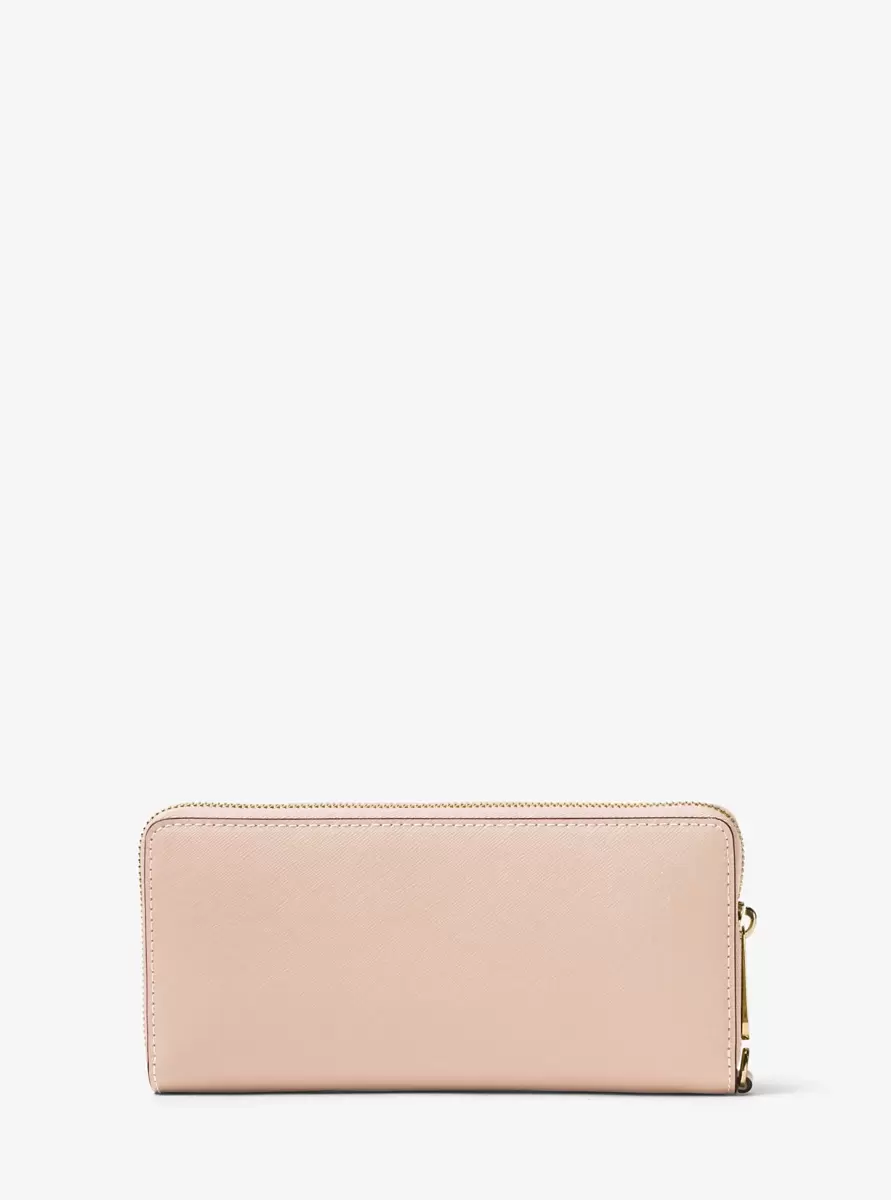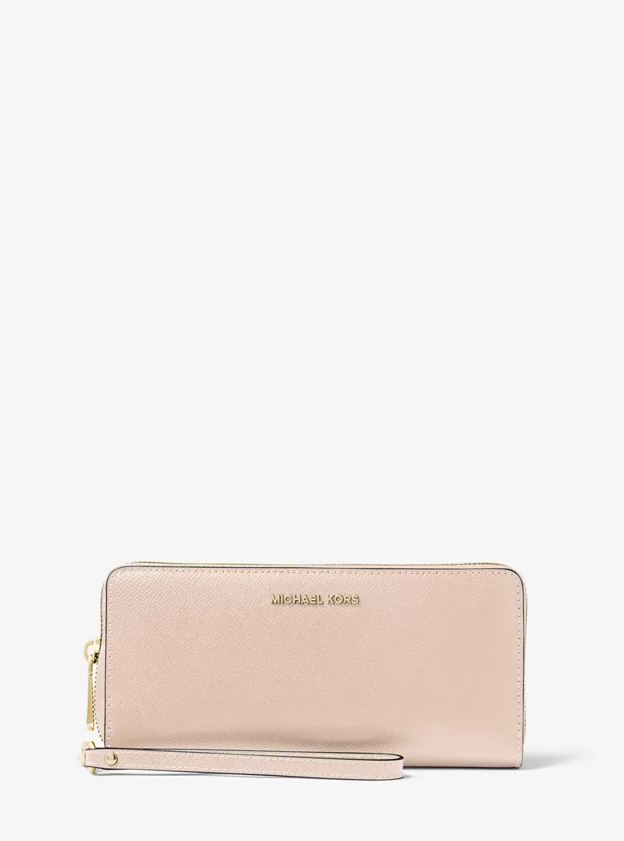In a timeless hue and ultra-luxe texture, you’ll want to keep our Jet Set Travel wallet within reach. Crafted from Saffiano leather, this classic accessory showcases an elongated shape with gold-tone accents and a continental zip closure.