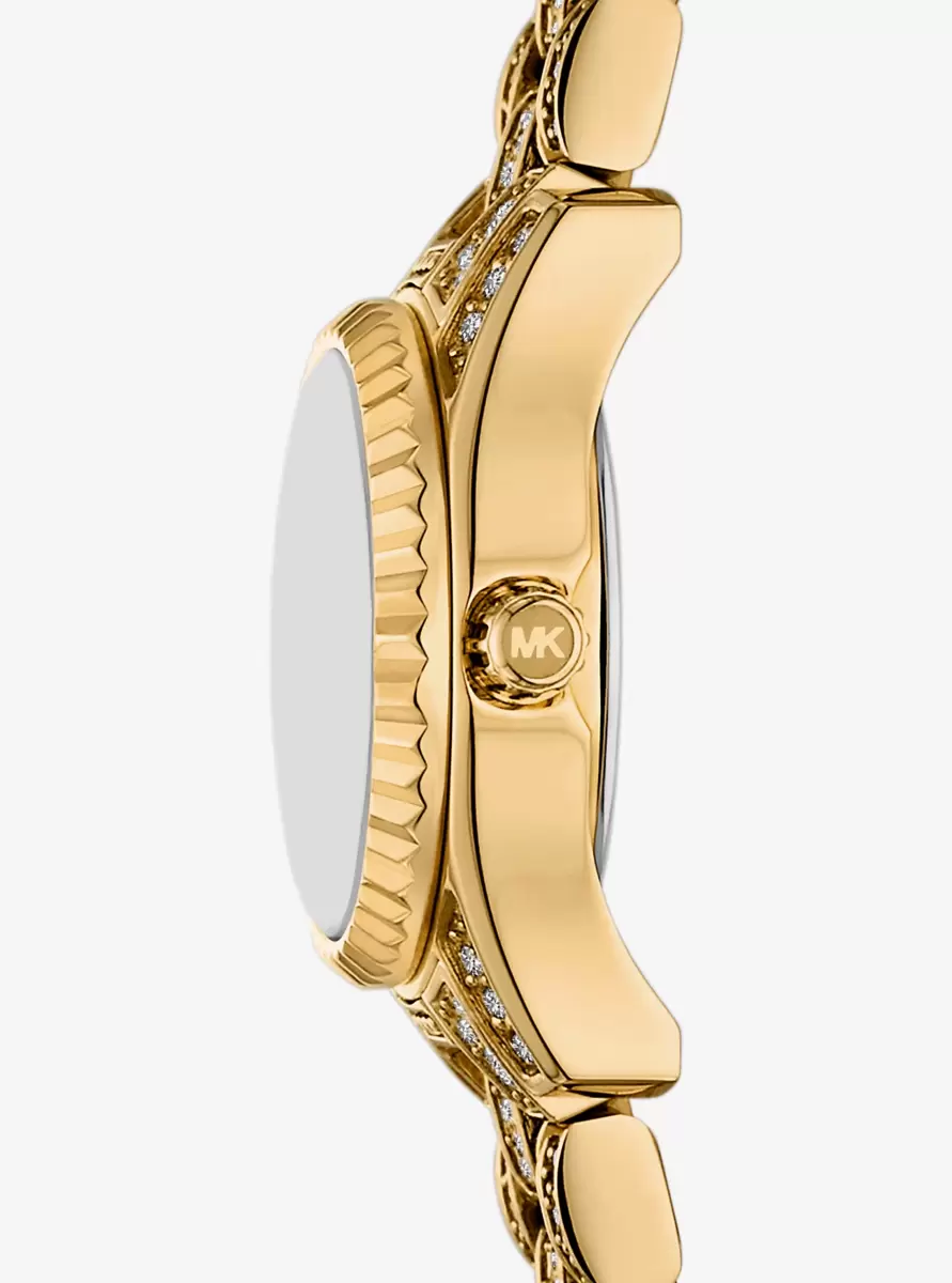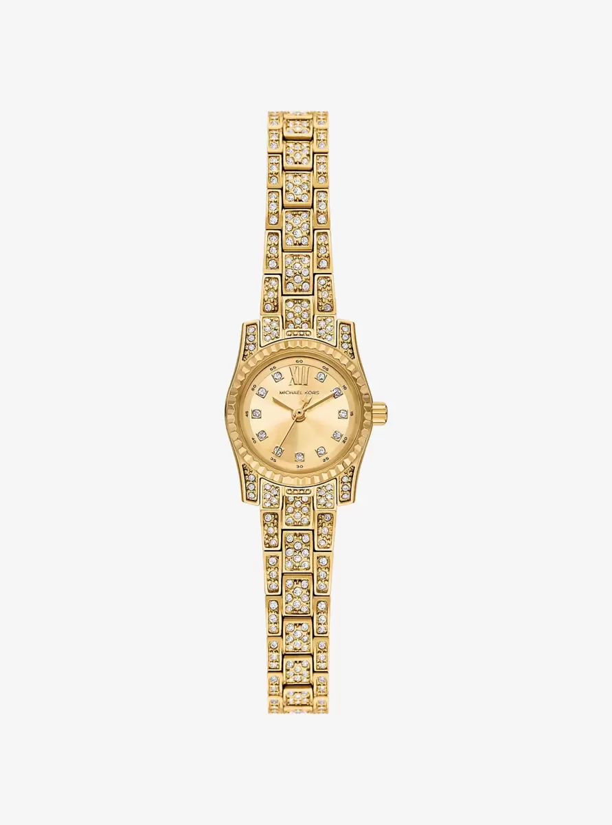 The Lexington watch exudes opulent glamour with its gold hues and sparkling pavé accents. Made entirely of stainless steel, this micro timepiece boasts a round face with a beveled topring and a matching bracelet strap. Slip it on to give evening outfits a maximum dose of dazzle.