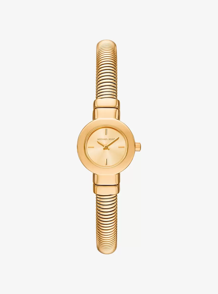 An instant classic: our slim-profile Gramercy watch.Designed in gold-tone stainless steel, this elegant style features anunderstated timeface and interlocking strap for textural contrast.