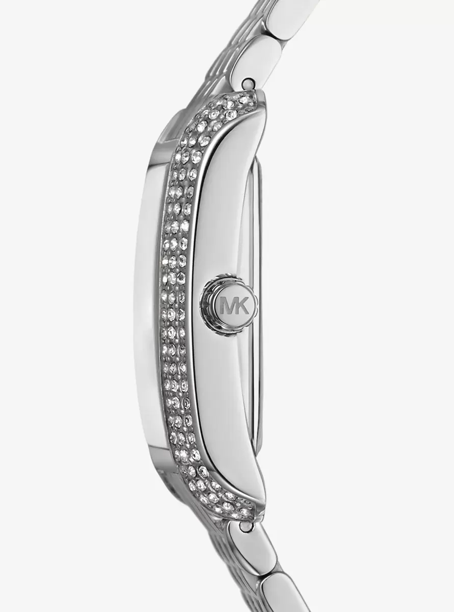 Side panels of understated pavé crystals add shine to the rectangular face of our petite Emery watch. The polished beveled strap is made of silver-tone stainless steel, while the iridescent blue dial features Roman numeral indexes for a luxurious finish. Glamorous enough to pair with evening looks yet understated enough to complement a simple T-shirt and jeans, this is a timeless style you’ll never want to take off.