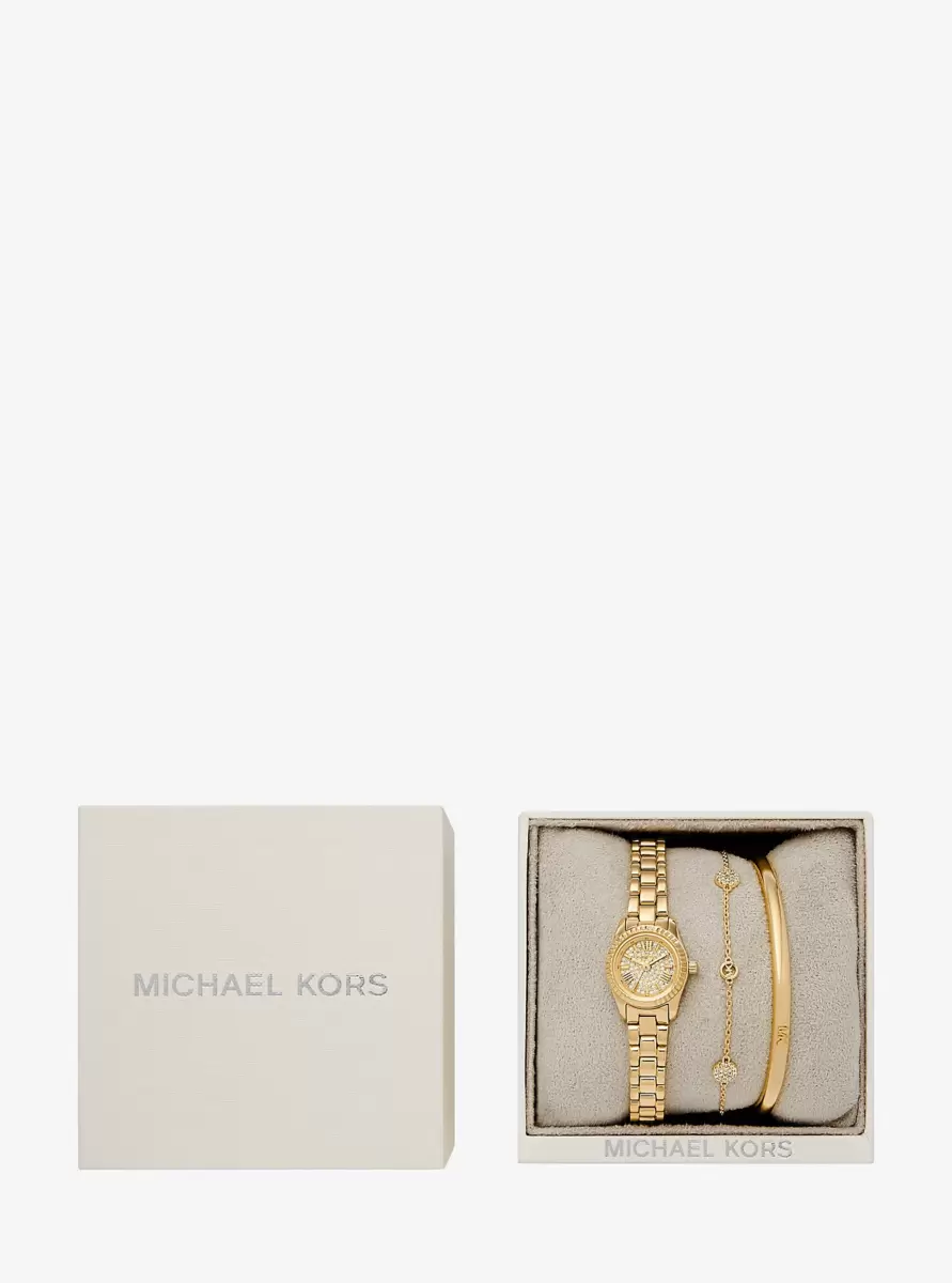 When it comes to gifting, more is definitely more. The mini timepiece in this set is crafted from stainless steel and features a dial illuminated by sparkling pavé stones. Complete with a sleek bangle and a pavé charm bracelet for added shine, this gift set is sure to please.